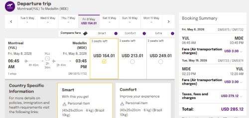 - If you choose the 'Smart Bundle' you can add a checked bag in the next step for $80 USD roundtrip.